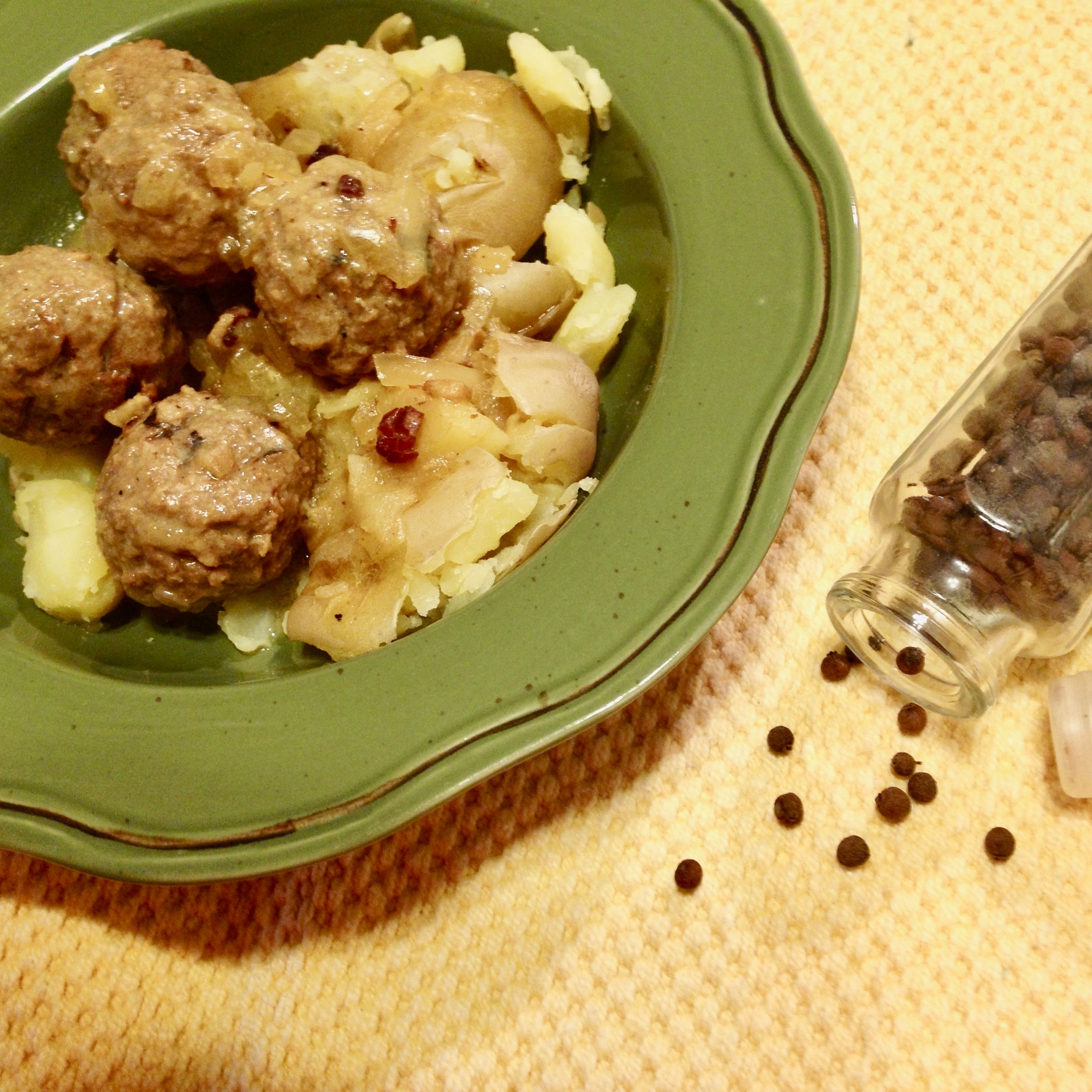 - Boil the potatoes and crush slightly with a potato masher. Serve the meatballs and sauce over the potatoes.
