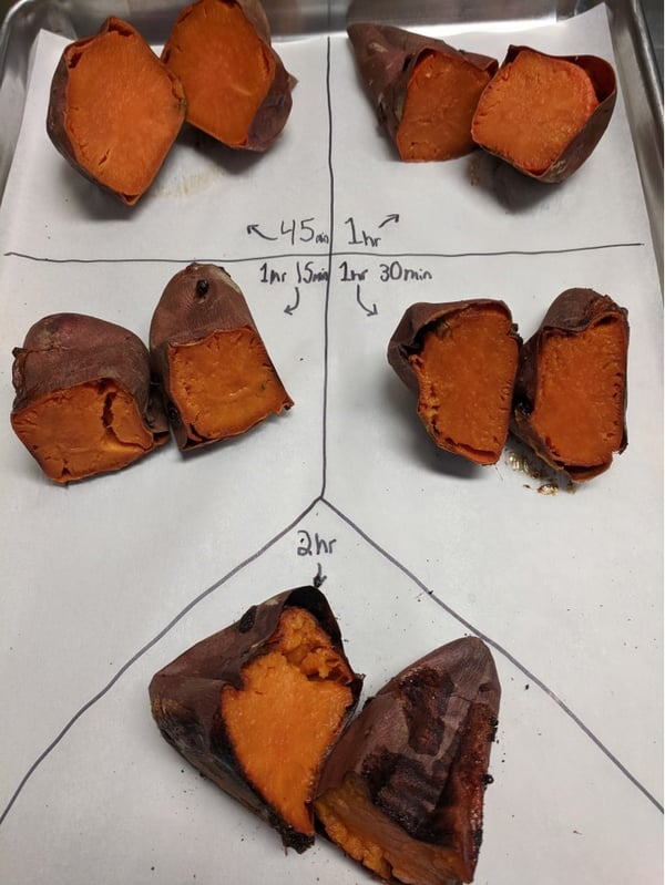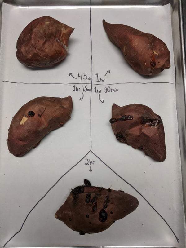 The holes are going to be a wonderful escape for steam. As the sweet potato cooks, it begins to soften and break down encapsulated and bonded water molecules that all plant cells grow with and thrive from. When those water molecules heat and turn into steam, they will escape from the holes and thus lower the water percentage of the potato. Some may think this is nothing special, but this is the first step to a miraculous event. The temperature on the inside of your potato begins to rise! As the process continues, the temperature will continue to rise until it hits your wonderous 340°F. No big deal, right? Nope, considering sugars begin to caramelize at about 320°F, this 340°F is a sweet spot that takes all of the natural fibers and begins to break them down into basic carbohydrates and then further into sugars and then further into simple sugars and boom: sweet nectar of the caramelized gods.