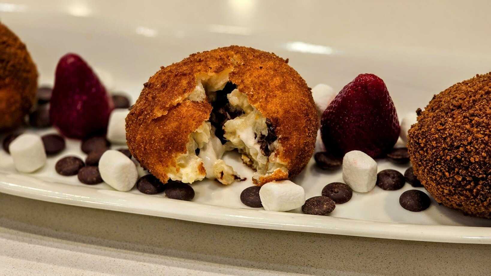 You can get really creative with fillings. I had s'mores on the brain once I decided on a graham crumb crust, so I wanted to do a chocolate chip and marshmallows filling. Other great choices would be frozen fruit (especially if you don’t add it to the rice) peanut butter with banana, Nutella, cream cheese and jam. The possibilities are endless. Once all of the portions are filled, I wrap the rice around and form them into spheres. If you’ve got extra time, refrigerating or freezing will make it easier to go through the breading process, but I admit I didn’t do that with this test.