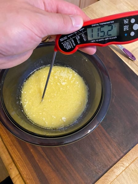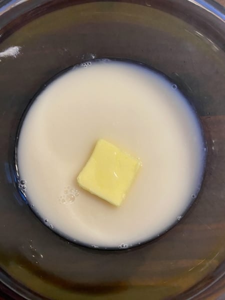 - In a separate bowl combine milk, butter, and water. Heat until butter is melted and allow to cool until the mixture is 115°F (This can be done in the microwave or in a sauce pot on the stove).