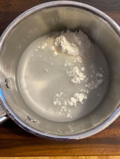 - In a small saucepot, combine the 30g of flour and 150g water. Mix and heat on low until the mixture forms a thick paste, similar to icing. Set aside and allow to cool to room temperature.