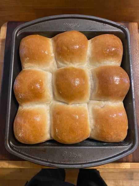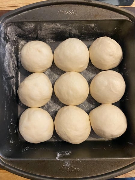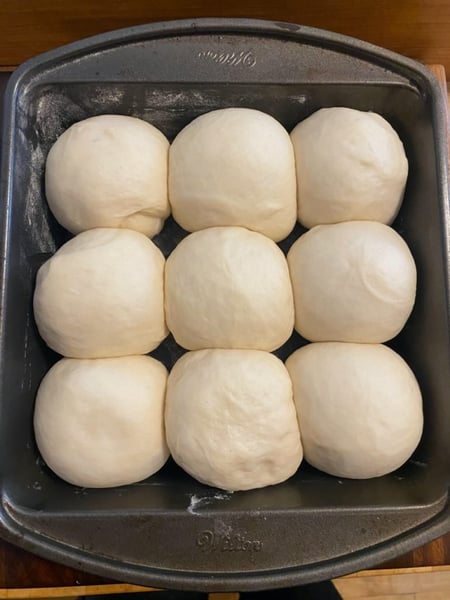 After the dough has risen, divide into 9 equal pieces (or your desired number of rolls) and place into a lightly buttered 9x9 baking pan. Again, cover and allow to double in size.