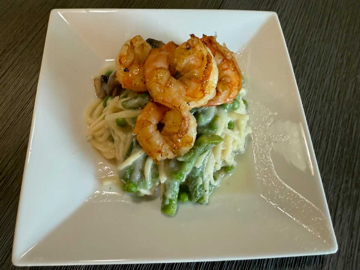 Hearts of Palm Noodles with Cauliflower Sauce, Mushrooms, Asparagus, Peas and Shrimp
