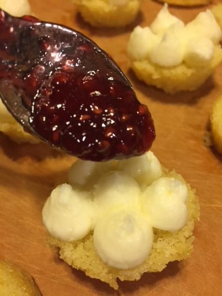 11. Pipe a small dot of the buttercream in the center of the bottom cake halves, and pipe 4 to 5 more dots around the center. Spoon a dollop of jam on top.