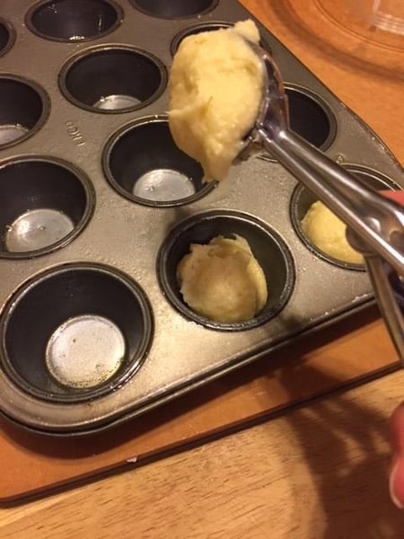 6. Spoon the batter into the prepared muffin tins, filing then half way.