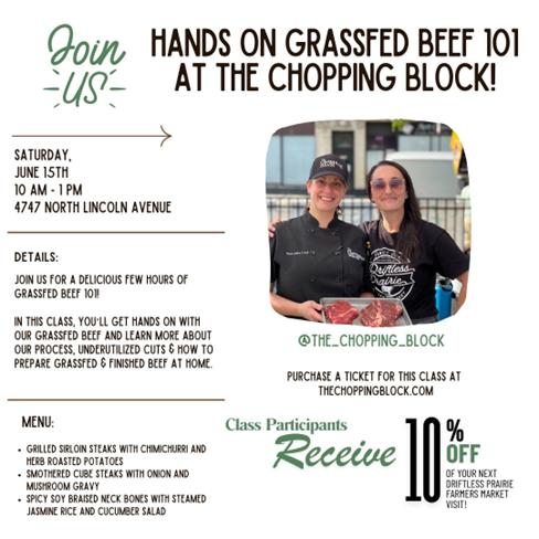 We will be back with free chef demos at the farmers market next Thursday, June 13 at 5pm and every other Thursday after that. Make sure you stop by and try the free samples and gain some cooking knowledge! Driftless Prairie and TCB may team up again at the market this year, but in the meantime, we have a very special cooking class planned on Saturday, June 15 at 10am featuring Megan's wonderful beef cuts and high-level instruction. This is a hands-on class, and you will learn about three different cuts of beef that you may not be familiar with and the proper cooking techniques that each piece requires, all of which are easily executed by the home cook. The best part is, if you sign up for the class Megan will give you 10% off any purchases made at the Driftless Prairie booth during your farmers market visit so you can stock up on all of these delicious beef cuts.