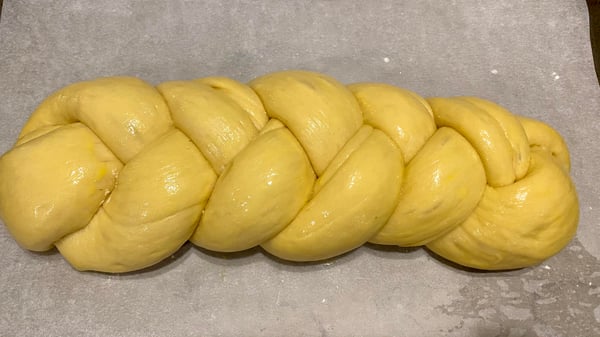 - Tuck the ends of the dough under and carefully lift the braided loaves onto the prepared sheet trays. Cover the loaves with plastic wrap, and proof until the dough is light and puffy and almost doubled in size.