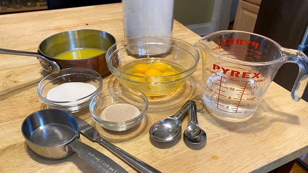It’s important to know that challah is what you call an enriched dough. Enriched doughs have a higher fat and sugar content, resulting in a soft and tender crumb (interior). The enriching components in this dough are melted butter, whole eggs, egg yolks and sugar. Keep in mind you need to allow your melted butter to cool a bit before adding it to the recipe. If it’s too hot, you risk killing the yeast, so build some time into the recipe to cool your butter. I used a spoon, and stirred my butter to let off the steam. I also took the temperature of the butter to ensure it was good to go.
