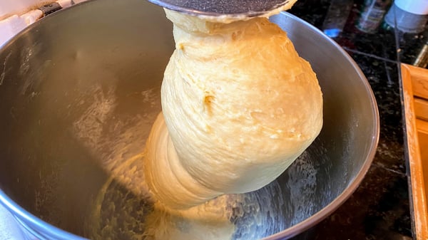 - If using a stand mixer, knead the dough until all of the ingredients are combined and the dough is no longer sticking to the sides of the bowl, about 5 minutes. If making this by hand, knead the dough for 7 to 10 minutes until smooth and elastic, adding a sprinkling more flour if needed.