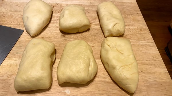 This is my favorite part, because the bread you’re making is really starting to take shape. Ha! See what I did there? Once your dough has risen, punch it down and divide into equal-sized pieces, the number of which depending on how many loaves you want to make. I like using a kitchen scale to ensure my pieces are the same size, which will also ensure the loaves will bake at the same rate.