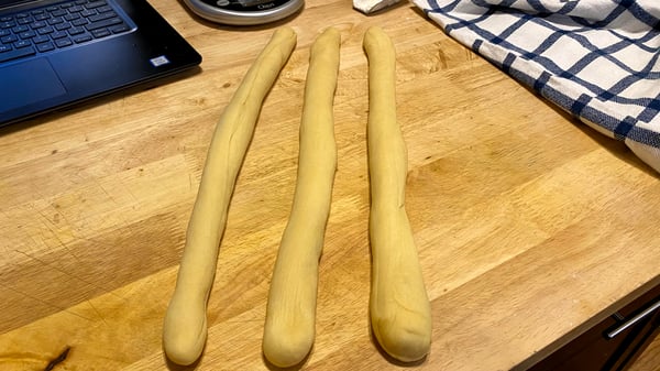 For the challah, you then roll the dough pieces into ropes that are about 1 1/2-inches in diameter. What I found in this step was that the surface of my dough was a bit dry, and when trying to roll the pieces into ropes, it just slid around on my table. What I needed was a bit of friction to give the dough something to grab onto. The answer? Water! I filled a small bowl with water, lightly dipped my hands in the water, allowing any excess to drip off, and then started rolling the ropes. This created enough traction to make the dough more cooperative.