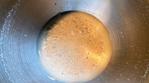 The first step in the recipe is to mix together the yeast, warm water and a pinch of sugar. The purpose of this step is to ensure your yeast is active and will do its job of raising the dough. Yeast thrives in warm temperatures and is slow to wake up in a cold environment, so the ideal temperature for your 3/4 cup of water is between 110° and 115°. Any hotter and you may end up killing the yeast, and any colder the yeast will be sluggish. A digital or instant read thermometer is a foolproof way to determine the temp of your water, but if you don’t have one, just make sure it’s warm to the touch.