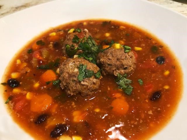 With cooler weather on the way, I can’t think of anything more inviting than a hot bowl of soup. This Tex-Mex Meatball Soup is a hearty, zesty soup that I really can’t get enough of. I always make a double batch because it is so delicious, and I definitely want leftovers for a couple of days. It is a complete meal too, which is a win for this busy momma. Full of vegetables, protein, and some carbohydrates, it really hits the spot.