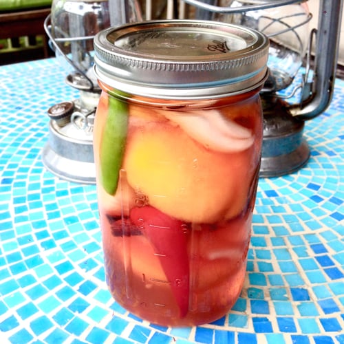 Funnel the apple cider and sugar mixture into the jar, making sure to leave a ¼ inch gap before sealing the jar. If you fill the jar with the vinegar mixture and there is still plenty of room left, just add some water making sure to still leave that ¼ inch gap before sealing. Place the peaches in the refrigerator for 24 hours before tasting to make sure the flavors are balanced with the right amount of sweetness and heat. The longer the peaches sit, the stronger those flavors become. I ended up with some pretty fiery and tasty peaches. They can be used in salads, on cheese and cracker boards, or you can use the juice in a vinaigrette. I’m planning on using the juice to create a spicy and sweet peach cocktail soon.
