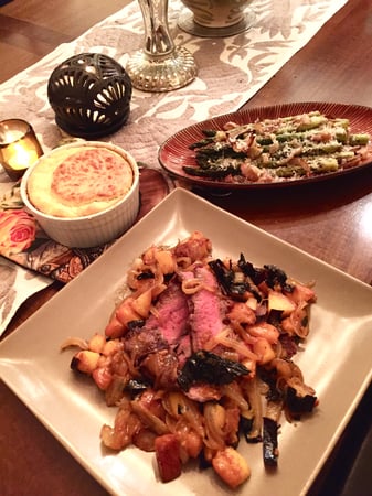 I used this sauce over grilled flank steak, but this sauce would be just as good on chicken, pork or even fish. I served fresh corn and Gruyere cheese soufflé, grilled asparagus with roasted shallots and freshly grated parmesan cheese with the flank steak and sauce. This was by far one of my favorite summer grilling dinners because this meal was what summer is all about for me.