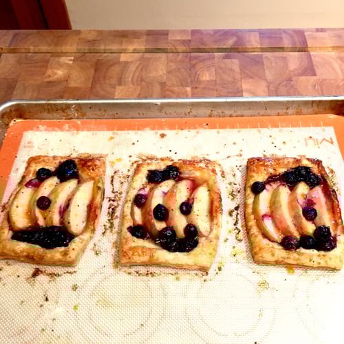 My parents came for a visit a couple of months ago, and I threw a casual dinner party in their honor. It was a fun evening filled with lots of good food and lively discussion. I wanted to create a dessert that would take advantage of the beginning of peach season. I came up with mini white peach and blueberry fruit tartlets, made with puff pastry dough.