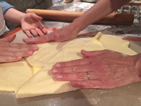 By the time I got to Le Foodist, I had already eaten 8 croissants (that might be conservative, actually), so I considered myself a connoisseur. The kitchen downstairs looks like the quintessential white brick French kitchen that you see in movies and magazines, so I felt like anything coming out of this kitchen would have to taste good! Making croissants is an all day project if you do it from start to finish because the dough needs to chill after each step of the process. Luckily our instructor, Amanda, broke down the steps for us so we got to work on each step without all the waiting. We began by learning how to make the dough. Then we moved on to the folding, rolling, shaping, lamination and baking. Did you know that if a croissant is curved (think crescent shaped) that it's made with margarine? If it’s straight it's made with real butter. I know, my mind was blown, too!