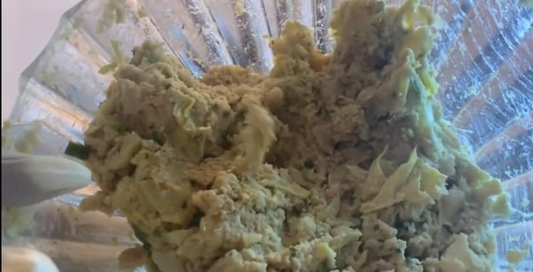 - In a food processor bow, add the garbanzo beans and hearts of palm. Pulse just a few times to break it up. Don’t pulse too many times or it will turn to mush. It should have a crab-like consistency. You can also do this manually; just use a fork or your hands to shred everything up. Set aside.