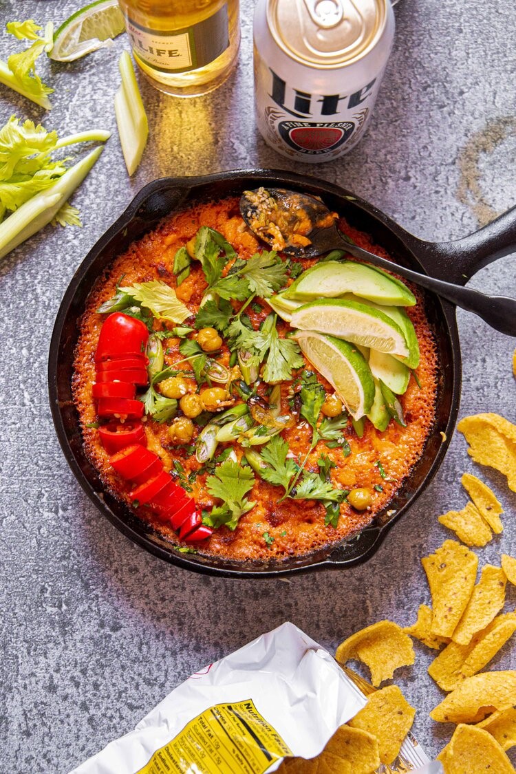 If you’ve known me for any amount of time, you know this recipe. It comes out at every party, football-related or not, because it’s one of those recipes that people talk about for weeks afterwards. My friends, I present to you: buffalo chickpea dip.