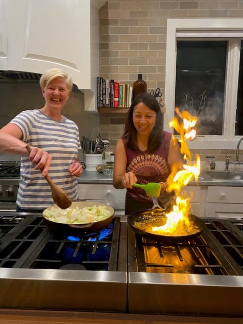 Shelley Young and Lillian Chou cooking in the "barn" in Michigan