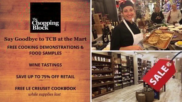 You have one last chance to experience The Chopping Block at the Mart tomorrow, Saturday, April 30. We'll have free cooking demonstrations, food samples, wine tastings, free Le Creuset cookbooks while supplies last, and you can save up to 75% off retail merchandise. Stop by to pay homage to this momentous part of our history!