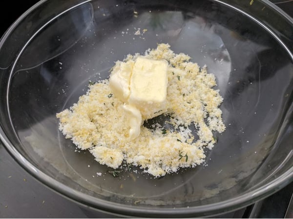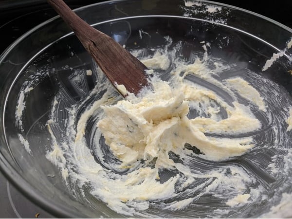 Once the zest and thyme were ready, we wanted to be sure to take these flavor additions to their maximum capacity by adding our sugar and salt. By introducing them at this step, we were able to use the sugar and salt crystals as a pomace to grind up the zest and thyme and pull all the flavor and juices out. After the maceration is complete, we jump back to the more traditional technique by adding the butter and creaming it together with then now flavor infused sugar and salt.