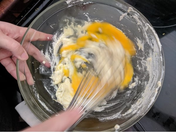 The bright, sweet, flavorful, butter mixture is ready at that point and next comes the eggs and milk.