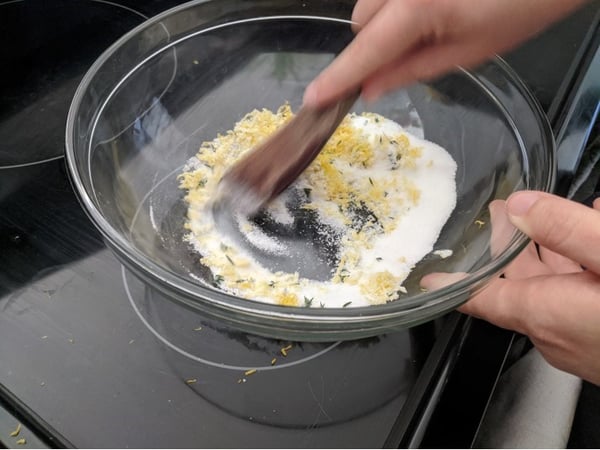 - In a large mixing bowl combine lemon zest, fresh picked thyme, salt and sugar. Stir well and using the back of your spoon pomace the ingredients together to release the oils.
