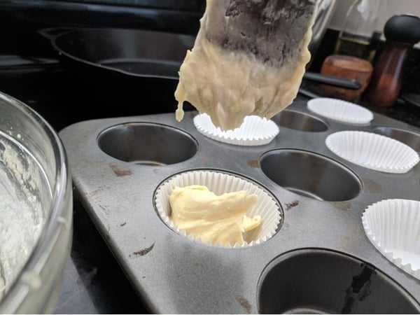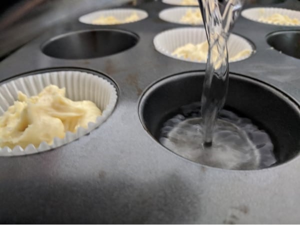 - Place muffin liners in muffin pan and fill each about 1/2-3/4 of the way up. Fill the empty muffin tins with water.