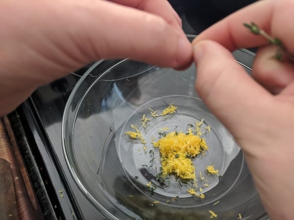 Next, we zested our lemons, making sure not to go over any spot more than once! This is because lemons zest is bright and intense, but only in the outermost skin which requires a Microplane grate to remove. If at any point you go past that outer most layer, you will be going into the pith which is bitter and has not true citrus flavor to add. Along with zesting our lemons we also picked our thyme leaves.