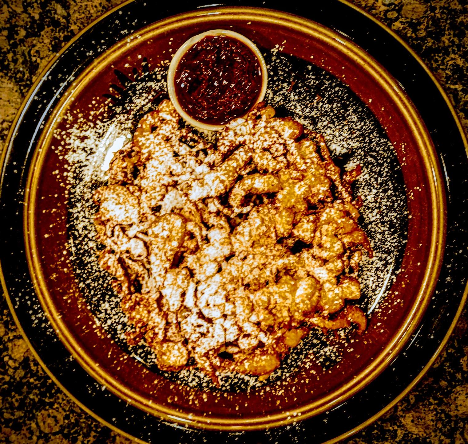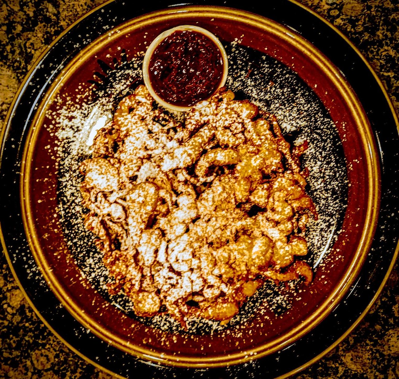 In the United States, funnel cakes originated with the Pennsylvania Dutch but now they are inextricable from any carnival or fair. What I wouldn’t give to learn the story of that polar leap: from the hearth of traditionalism and restraint to those showmanship and thrill-seeking hubs of new and surface value. They are two groups I don’t picture crossing paths much. Did a young baker pass Rumspringa with the circus? Did a carnival barker approach a Lancaster farmhouse for a flagon of water and witness, through the window, the production of the funnel cake, aromas intoxicating? No matter, history has spoken and made available, periodically, the funnel cake to anyone out to see some 4H rabbit breeds or ride the Whirl-E-Gig. The populace has benefitted; I truly hope the Pennsylvania Dutch aren’t miffed.