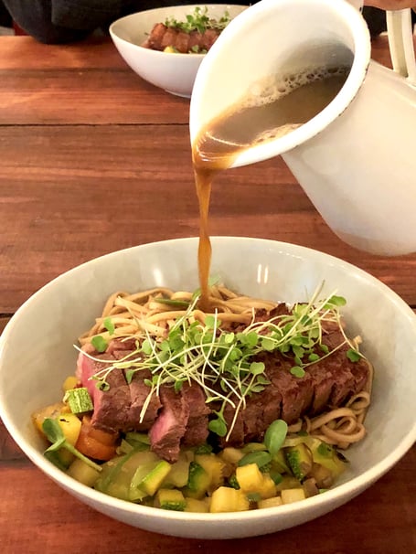 One of the first new restaurants we tried was Marchanta Comedor. It’s manned by a couple of young, inventive and extremely talented chefs that wear some of the coolest chef aprons. We each had a craft cocktail that had a gazillion ingredients. It took a while for the bartender to create them, but they were definitely worth the wait! We shared an appetizer of “tostadas with salsa macha”, which is a traditional Mexican sauce of several toasted dried chile peppers, spices, olive oil, nuts, seeds and garlic, pureed in a blender or mashed into a paste using a Molcajete (a traditional Mexican mortar and pestle made from volcanic lava rock). We also shared a salad of Cured Cactus, heirloom cherry tomatoes, farmers cheese, charred avocado, served on a bed of green seeds from the amaranth family, called “huazontle”. The star of the meal was the chef’s version of Vietnamese Pho, which consisted of several vegetables, homemade noodles, large strips of sirloin cooked to a perfect medium rare, in a rich beef broth that was slowly poured into the bowl at tableside.
