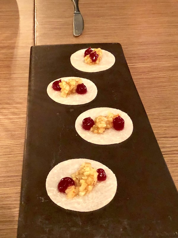 We were extremely lucky to have been invited to dinner at Aperi by friends of friends in Chicago. Bob and Mary were visiting San Miguel for the first time and their visit just happened to coincide with ours. They offered to treat us to dinner at Aperi, and we were floored! It was such a kind and generous gesture. We each selected the chef’s tasting menu with wine pairing. The superb meal began with each of us having a wonderful cocktail, followed by a delicious “amuse bouche” followed by the 6-course dinner.