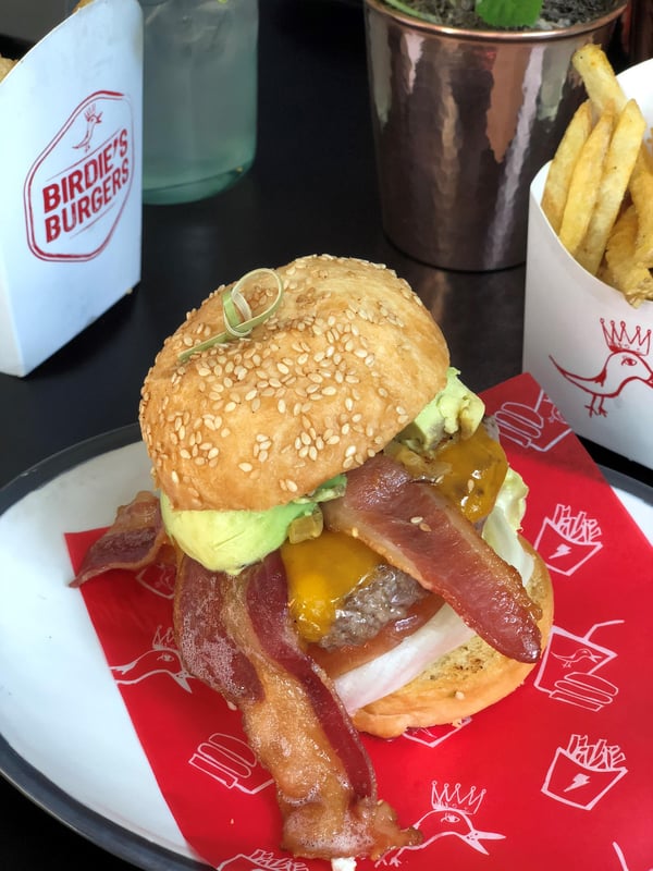 We finally made it to chef Donnie Masterson’s restaurant Birdie’s Burgers. Donnie is the owner and chef of one of the premier restaurants in San Miguel called “The Restaurant”. He’s known for his inventive approach to seasonal ingredients as well as a fantastic food, served in a great atmosphere and with impeccable service. Every Thursday is Hamburger Thursday at “The Restaurant” and it has become a huge success for Donnie. So, a couple of years ago Donnie opened up the burger joint Birdie’s Burgers. The burger is not a huge behemoth of a burger, which I think is great! It’s small and the hamburger patty is made with beef from a cattle ranch that is on the outskirts of San Miguel. The beef is 100% organic, grass fed and grass-finished. It was perfectly cooked, the right size, with simple condiments and toppings and served with French fries. Chef Donnie also has another restaurant right along side of Birdie’s Burgers called “Taco Lab” and the tacos are seriously as the logo spells out “tacolicious”!