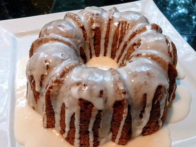 - Once the cake has cooled completely, spoon the glaze on top of the cake, allowing it to run down the sides. Note: Don’t worry if some of the glaze pools in the center and around the sides of the cake. That’s the best part!