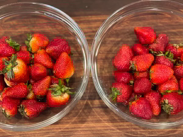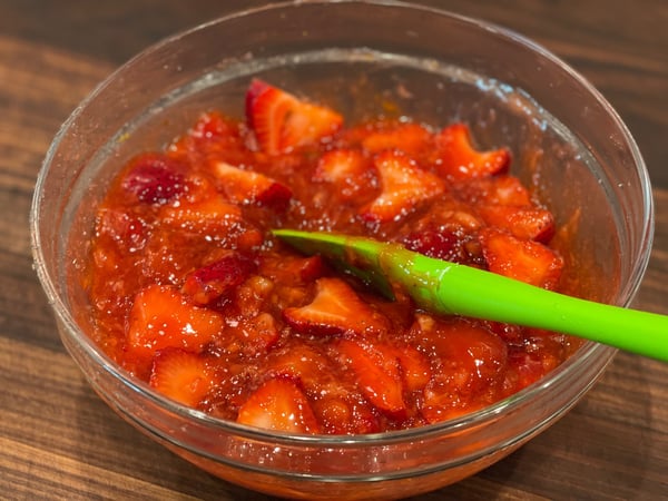 - Take the strawberries that are not as red and ripe and use those to prepare the filling. Since they will be cooked a little, the less-perfect strawberries will “ripen” and become sweeter and more flavorful in that process. The better-looking berries will be sliced and folded into the cooked filling.