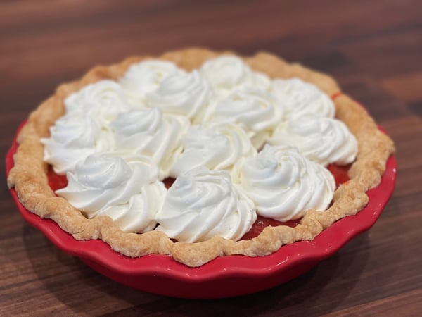 Prepare your own whipped cream or use your favorite whipped topping to garnish your pie generously. I suggest at least four cups of whipped cream but you may choose to use more.