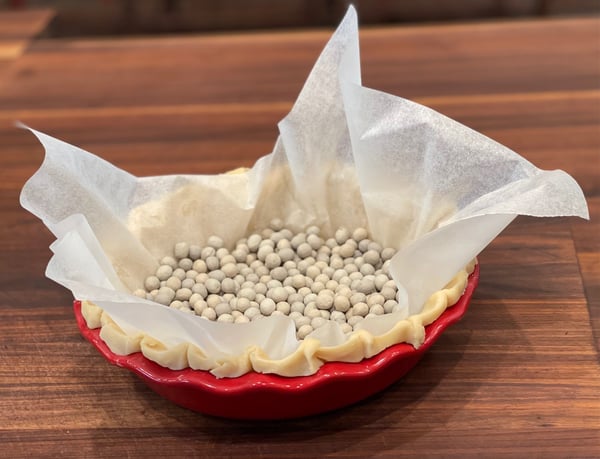 Once your pie crust is rolled, place into your pie dish and prick with a fork all over the surface. Refrigerate the rolled crust and preheat your oven to 350 degrees. Chilling the crust completely really helps to keep the crust from shrinking. Additionally, place a piece of parchment paper or aluminum foil inside the crust and fill with an even layer of pie weights, pennies (washed) or dried beans, this weight will help to keep the bottom crust from bubbling up and the crust shrinking.