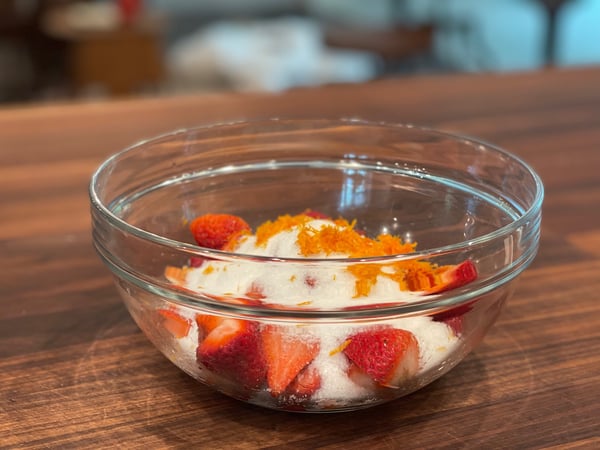 - Place roughly sliced strawberries in a 3-quart sauce pan and turn on low heat. Smash the berries, sugar, salt, lemon and orange zest with a potato masher, the low heat will help to soften the berries slightly to aid with the smashing. Turn the heat up to high and bring the smashed strawberries to a boil.