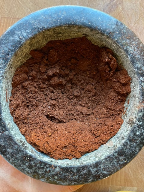 3. Once the spices are toasted, grind them to a fine powder. I really like a small mortar and pestle for this, but whatever you use to grind spices will work.