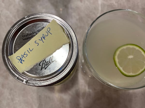 The first step in making the Secret Beach, is to prepare a basil-infused simple syrup. Simple syrup is simple to make (no pun intended!) and can be customized to your liking. In its most basic form, it’s one part granulated sugar to one part water. Combine the two in a saucepan and set over medium-high heat. As soon as it comes up to a boil and the sugar has dissolved, remove it from the heat and allow to cool. For our version, we added fresh basil leaves to the hot syrup and allow them to steep for 30 minutes, but you can add any herbs you like such as mint, lavender, rosemary or thyme. You can also add any fruit or citrus of your choice, extracts, and spices. Once the syrup has been infused, strain it through a fine sieve into a mason jar or any other container of your choice and allow it to cool in the fridge. Once in the fridge, it will last for several months.