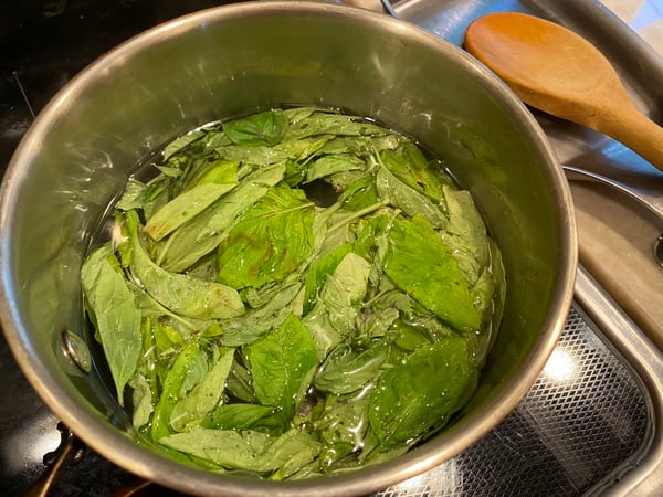2. Strain the syrup through a fine sieve, pressing the leaves with a spoon, into a mason jar or any other container of your choice, and refrigerate until cold.