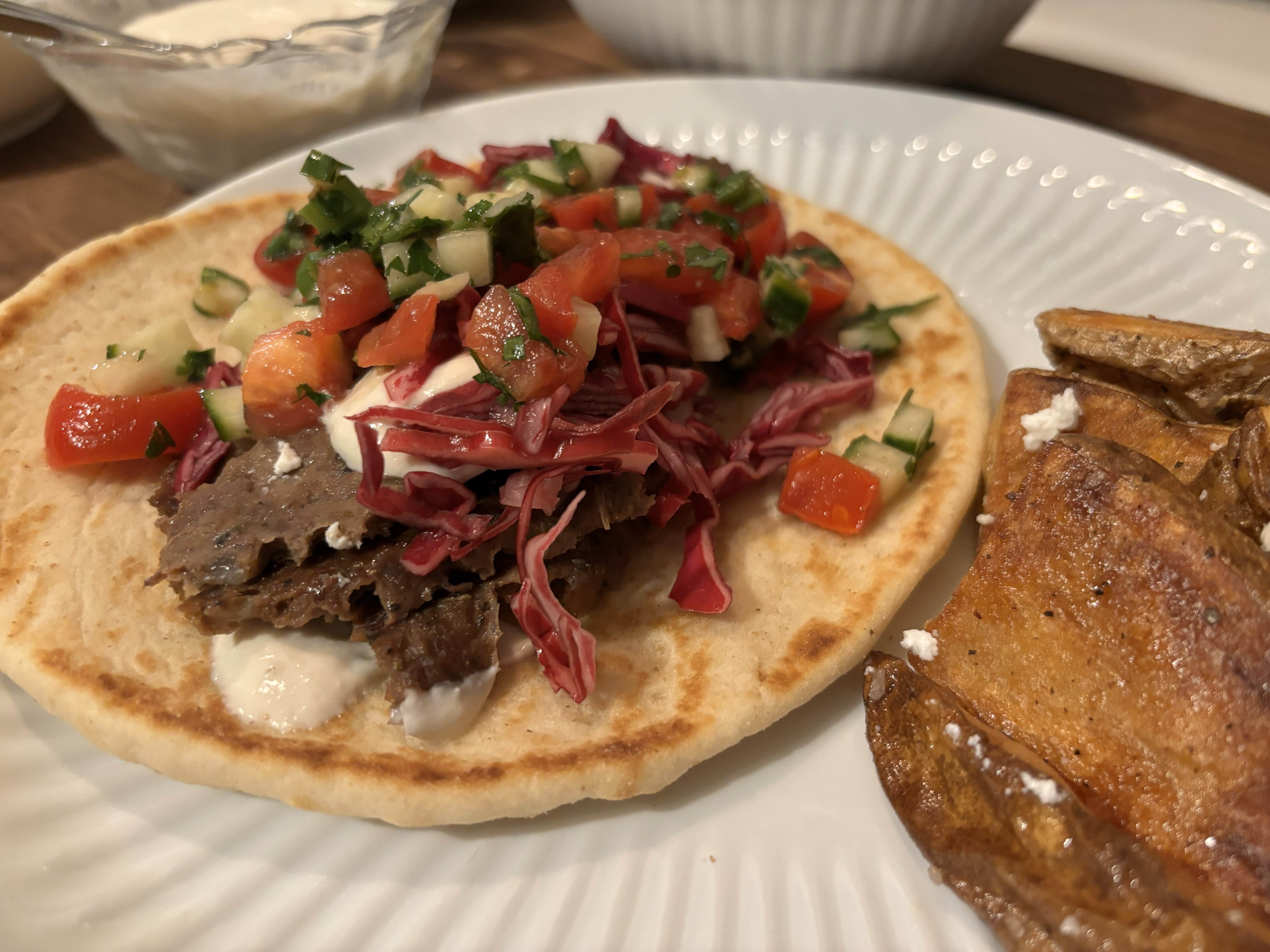 The meat in a doner kebab is typically made from beef and/or lamb, while gyros are more often prepared with pork, lamb or chicken. Doner kebab meat is seasoned with a warm blend of spices such as cumin, coriander and smoked paprika whereas gyros rely more on dried herbs. A doner kebab is usually served with a simple yogurt-garlic sauce, while gyros are topped with tzatziki, a mixture of yogurt, grated cucumber and dill. So, while the two dishes share similarities, they each have their own distinct flavors, but most importantly they’re both delicious!