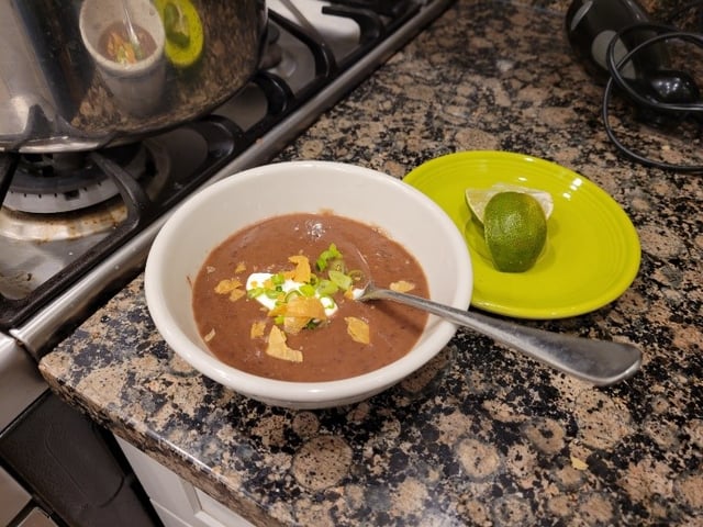My third soup was black bean. This time I sautéed onion and garlic, bell pepper, tomato and tomatillo.