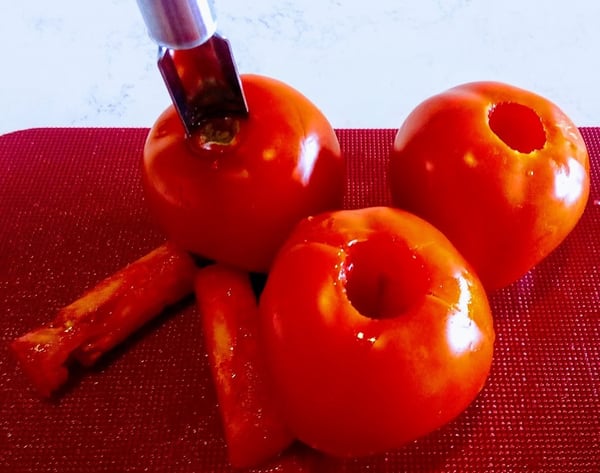 - Stir the diced tomatoes, brown sugar, sherry vinegar and black pepper into the onion mixture and then add the crumbled bacon. Stir water into the mixture and cook until the jam is a brick-brown color and has a thick consistency, 10 to 15 minutes. I prefer this jam to be really chunky, but if you like a smoother consistency, chop the ingredients more finely during prep. I also use a handy tomato corer – once the core is removed, just chop the whole tomato and the seeds will fall away on their own. Tip: If you use a cutting board with a groove, it will catch the juice for easier clean-up.