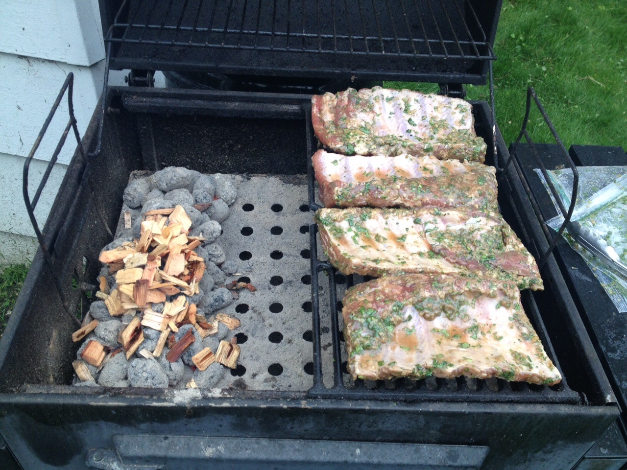 Right before I put the marinated ribs on the grill, I sprinkled the soaked wood chips over the hot coals and then placed the ribs, meaty-side down, on the cooler side of the grill. I closed the lid, and let them smoke for about 30 minutes. I flipped them, sprinkled some more wood chips on the hot coals, and let them smoke for another 30 minutes.