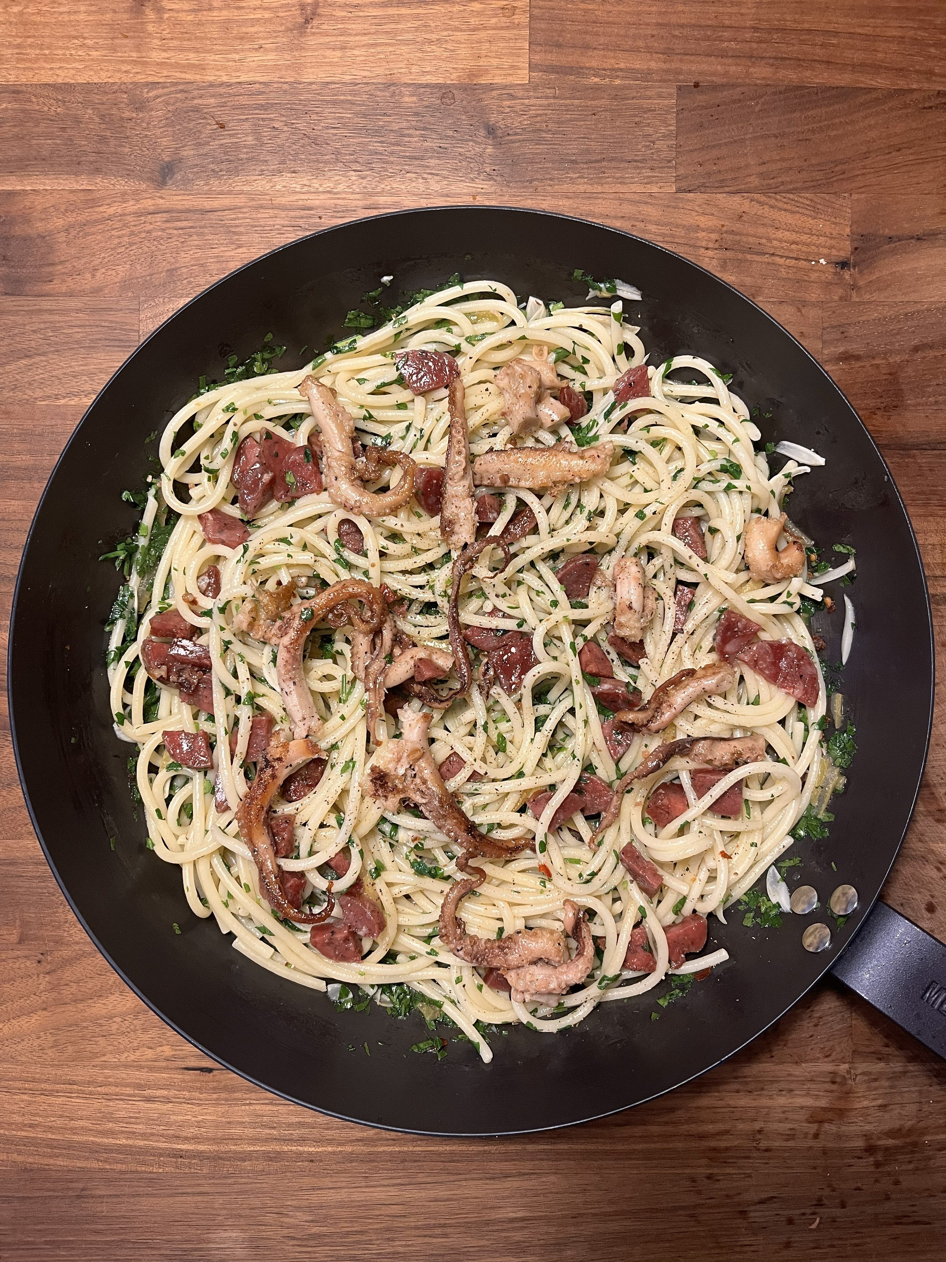 Back to my cupboard. I’ve got some Spanish razor clams in brine and octopus in garlic sauce. Time to see what else is in the fridge and get creative.