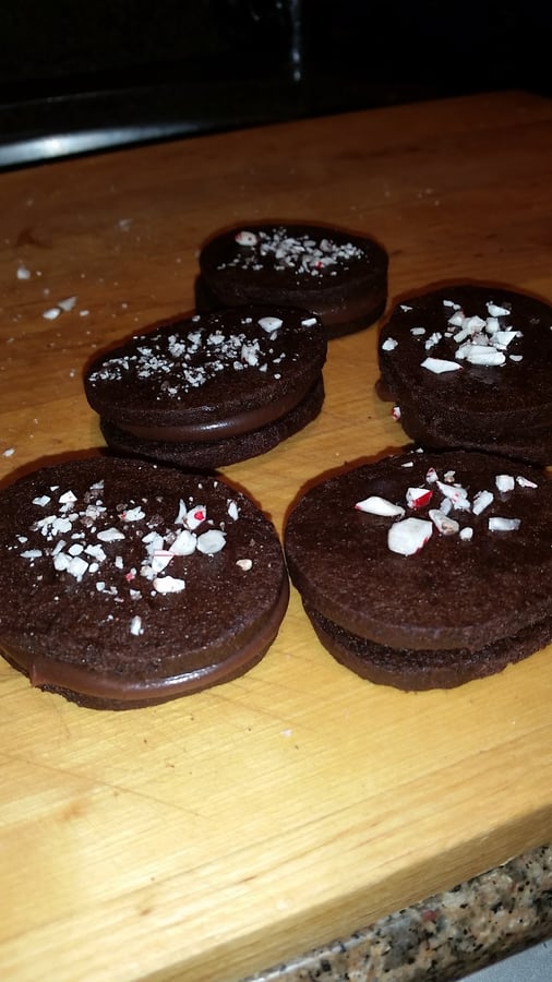 To assemble take your cooled cookies and spread them out flat side up. Next, scoop or pipe some of the ganache in the center of half of the cookies. Put another cookie on top and voila, you have a perfect sandwich cookie! To top off these beautiful sandwich cookies I made a thin powdered sugar glaze to act as glue to sprinkle crushed up candy canes on top! The glaze was 2 tablespoons of powdered sugar and 3 tablespoons of milk. It should be very thin, add more milk as needed so it dries clear. Just brush the tops of the cookies and sprinkle on your candy canes.