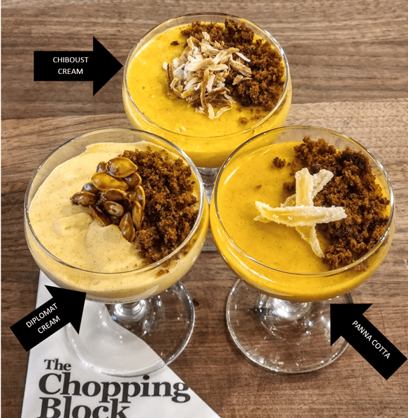 A custard is defined by a mixture of dairy, flavoring and thickened with egg. There are variations of custards where you can thicken with cornstarch or even set with gelatin, and they can be baked or cold. So, I set off to make three different variations. I started with making a pastry cream but instead of using whole milk, I used 2 cups of my coconut milk and pumpkin mixture.