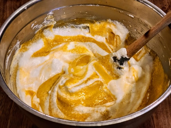 Once my gelatin pastry cream was cooled, I split it into 2 bowls and folded in whipped cream into one batch and whipped egg whites into another batch. The whipped cream was mousse like in texture, really light and airy with great pumpkin flavor. This mixture is called a diplomat cream.